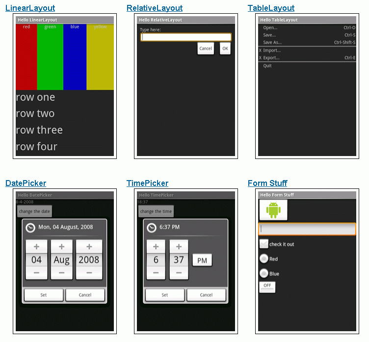 | Table Layout | 任意の列数および行数のテーブルレイアウトで、セルに好みのウィジェットを保持する。行は最大のカラムに合わせリサイズされる。 セルの境界線は見えない。 |