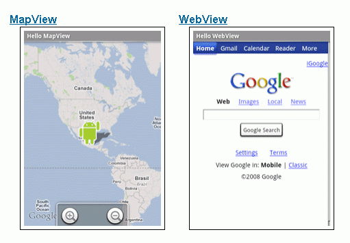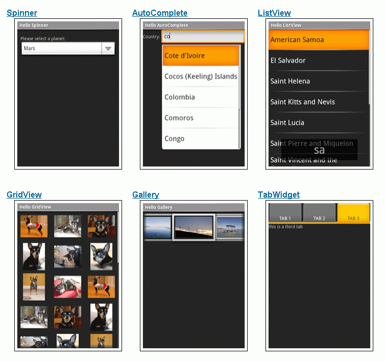 | Tab Host | タブ選択リストを提供し、そのクリックを監視する。アプリケーションでタブがクリックされたときにスクリーンを変更することが可能。 |